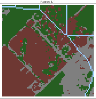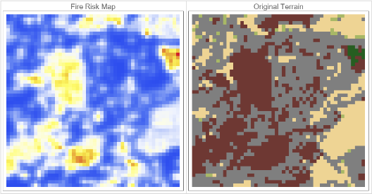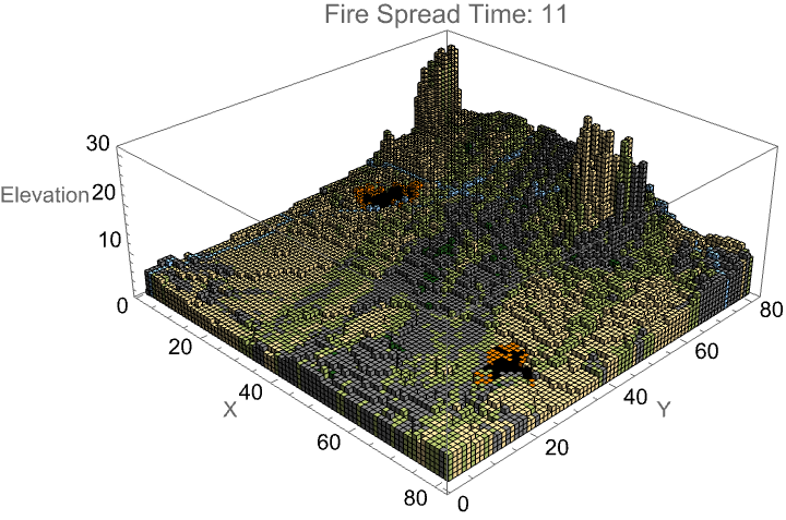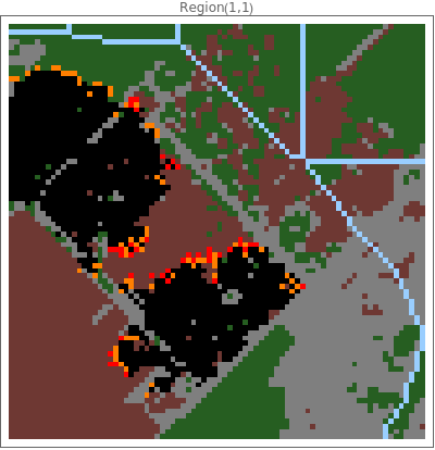 runFireSimulation[gridSize_:80,initialFires_:2,timeSteps_:100,ignitionProbability_:0.8,windSpeed_:0.3,windDirection_:{1,0},moisture_:0.2,numRows_:1,numCols_:1,interRegionSpreadProb_:0.5,uphillMultiplier_:1.5,downhillMultiplier_:0.7,location_:Automatic]:=Module[{terrainGrids,elevationGrids,fireGrids,unburnedPositions,firePoints={},terrainAndElev,actualLocation,result,gridPos},actualLocation=If[location===Automatic,getRandomEarthLocation[],location];terrainGrids={};elevationGrids={};Table[terrainAndElev=initializeTerrainGrid[gridSize,actualLocation];AppendTo[terrainGrids,terrainAndElev[[1]]];AppendTo[elevationGrids,terrainAndElev[[2]]];,{i,numRows},{j,numCols}];terrainGrids=ArrayReshape[terrainGrids,{numRows,numCols,gridSize,gridSize}];elevationGrids=ArrayReshape[elevationGrids,{numRows,numCols,gridSize,gridSize}];fireGrids=Table[ConstantArray[0,{gridSize,gridSize}],{i,numRows},{j,numCols}];unburnedPositions=getUnburnedPositions[fireGrids[[1,1]]];unburnedPositions=Select[unburnedPositions,terrainGrids[[1,1,#[[1]],#[[2]]]]!=6&];result=DialogInput[DynamicModule[{currentPoint={15,15},selectedPoints={}},Column[{Text["Click on the terrain to place fire starting points"],Text[Dynamic["Points selected: "<>ToString[Length[selectedPoints]]<>"/"<>ToString[initialFires]]],LocatorPane[Dynamic[currentPoint],plotAllFireRegions[terrainGrids,fireGrids,numRows,numCols],Appearance->Graphics[{Red,PointSize[0.05],Point[{0,0}]}]],Row[{Button["Add Fire Point",gridPos={Clip[Round[currentPoint[[1]]],{1,gridSize}],Clip[gridSize-Round[currentPoint[[2]]],{1,gridSize}]};If[terrainGrids[[1,1,gridPos[[1]],gridPos[[2]]]]!=6,AppendTo[selectedPoints,gridPos];,MessageDialog["Cannot place fire on water!"]],Enabled->Dynamic[Length[selectedPoints]<initialFires]],Button["Reset",selectedPoints={}],Button["Run Simulation",If[Length[selectedPoints]>0,DialogReturn[selectedPoints],MessageDialog["Please select at least one fire point!"]],Enabled->Dynamic[Length[selectedPoints]>0]],Button["Cancel",DialogReturn[$Canceled]]}]}]]];If[result===$Canceled,Echo["Simulation canceled by user."];Return[$Canceled]];If[Length[result]==0,Echo["No fire points selected."];Return[$Failed]];firePoints=result;Echo[{"Starting simulation with ",Length[firePoints]," fire points at: ",firePoints}];showBurnFireGrids[firePoints,terrainGrids,elevationGrids,fireGrids,numRows,numCols,gridSize,ignitionProbability,windSpeed,windDirection,moisture,interRegionSpreadProb,timeSteps,initialFires,uphillMultiplier,downhillMultiplier,actualLocation]]