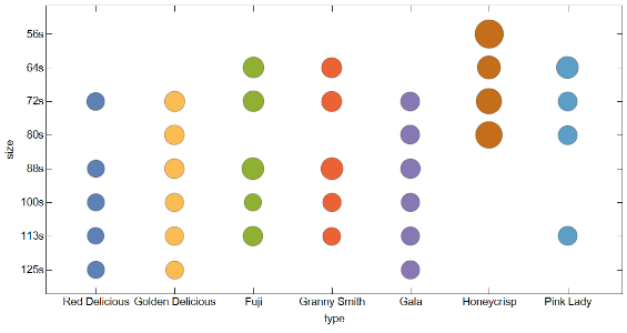 {{{Red Delicious,72s,36.},{Red Delicious,88s,34.5},{Red Delicious,100s,34.5},{Red Delicious,113s,32.5},{Red Delicious,125s,34.5}},{{Golden Delicious,72s,46.5},{Golden Delicious,80s,45.},{Golden Delicious,88s,43.5},{Golden Delicious,100s,39.5},{Golden Delicious,113s,38.5},{Golden Delicious,125s,35.5}},{{Fuji,64s,48.5},{Fuji,72s,48.},{Fuji,88s,56.},{Fuji,100s,34.5},{Fuji,113s,44.}},{{Granny Smith,64s,46.5},{Granny Smith,72s,46.5},{Granny Smith,88s,54.},{Granny Smith,100s,38.5},{Granny Smith,113s,36.5}},{{Gala,72s,42.},{Gala,80s,42.},{Gala,88s,44.},{Gala,100s,39.5},{Gala,113s,39.},{Gala,125s,38.5}},{{Honeycrisp,56s,92.5},{Honeycrisp,64s,62.5},{Honeycrisp,72s,75.5},{Honeycrisp,80s,80.}},{{Pink Lady,64s,56.},{Pink Lady,72s,42.},{Pink Lady,80s,41.5},{Pink Lady,113s,42.}}}