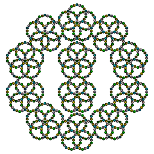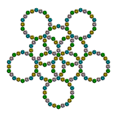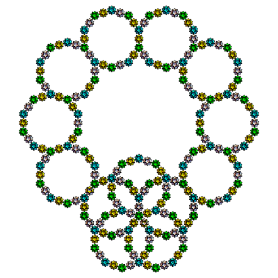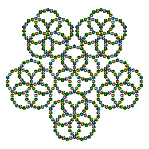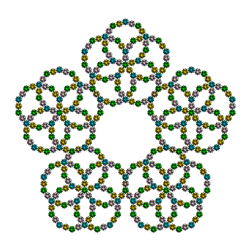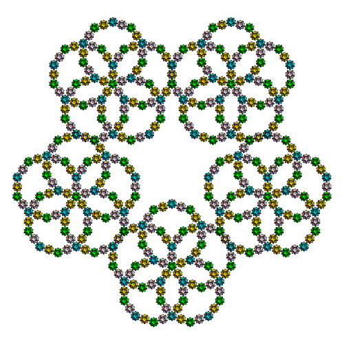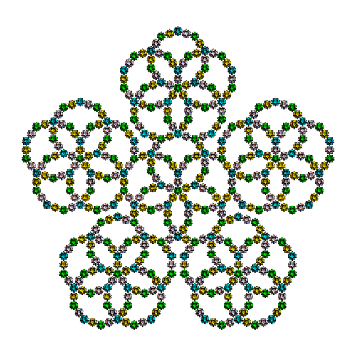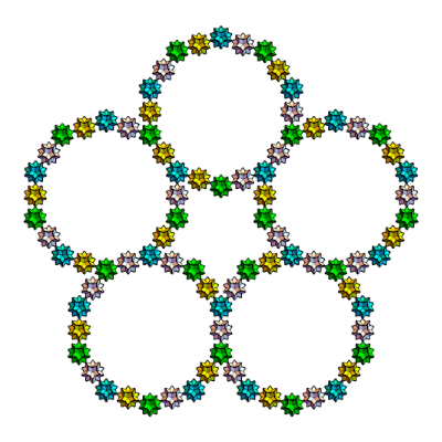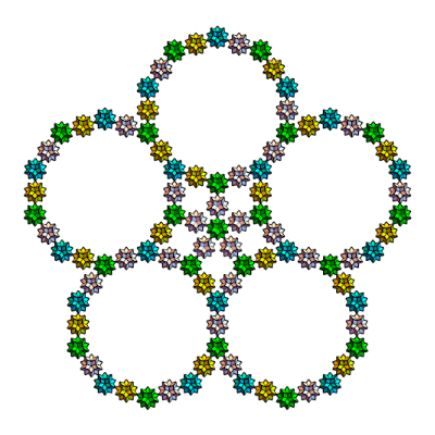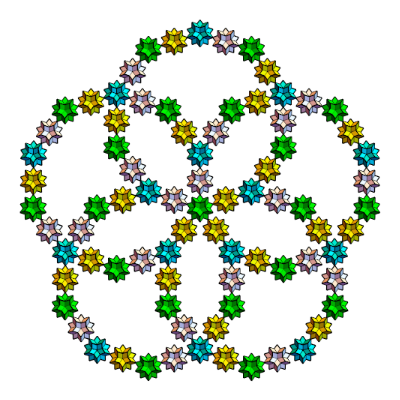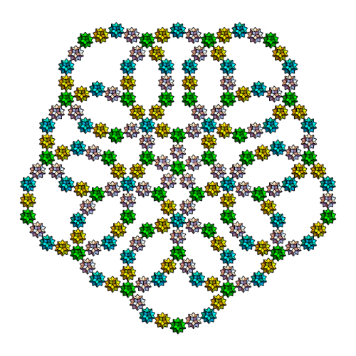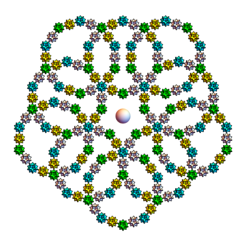 s1={Yellow,Rotate[Rotate[Translate[Rotate[icoup,Pi,{0,0,1}],{0,0,0}],-alf1-bet,{1,0,0}],2Pi/5,{0,0,1}]};s2={Cyan,Rotate[Rotate[Translate[Rotate[icoup1,Pi,{0,0,1}],{0,0,0}],-alf1-bet,{1,0,0}],2Pi/5,{0,0,1}]};s3=Rotate[Rotate[Translate[Rotate[icoup,Pi,{0,0,1}],{0,0,0}],-alf1-bet,{1,0,0}],-2Pi/5,{0,0,1}];s5=Table[Rotate[{s3},i2Pi/5,{0,0,1}],{i,5}];s5o=Table[Rotate[Rotate[{s3},Pi,{0,1,0}],i2Pi/5+0.001,{0,0,1}],{i,5}];Graphics3D[{s5,s2,icon},ImageSize300,ViewPoint{0,0,10},BoxedFalse,SphericalRegionTrue]