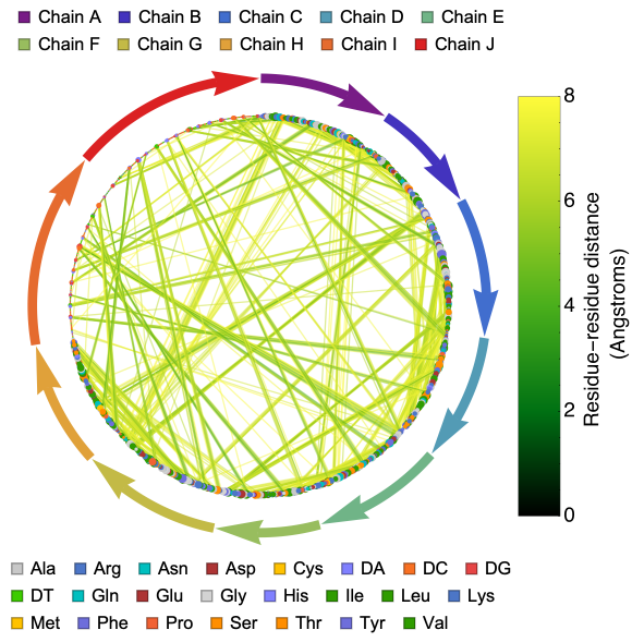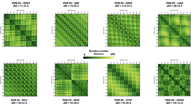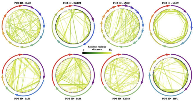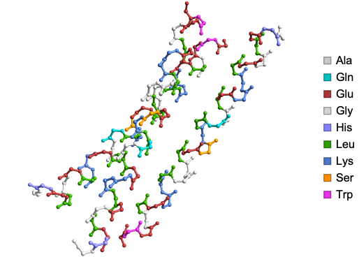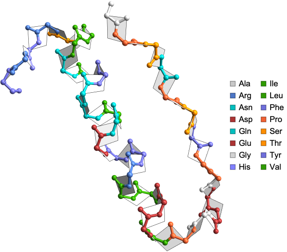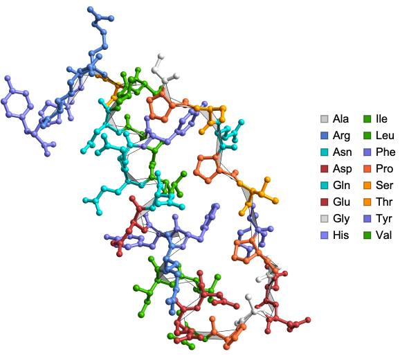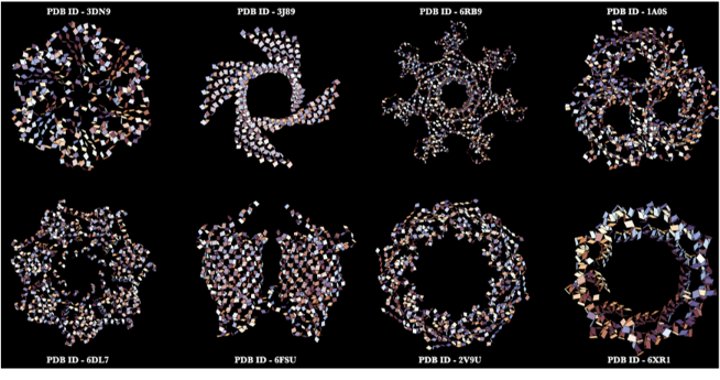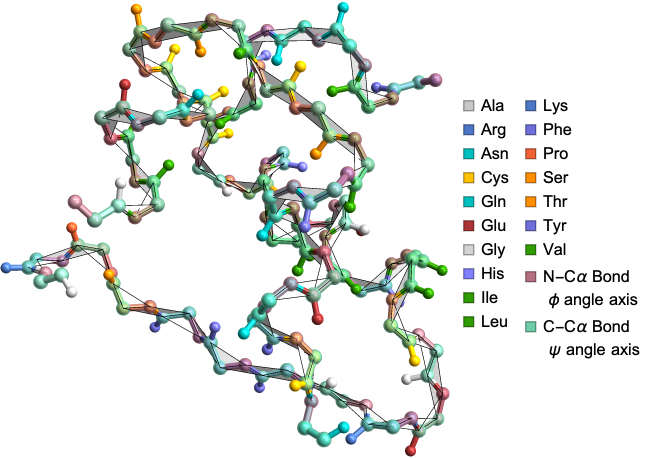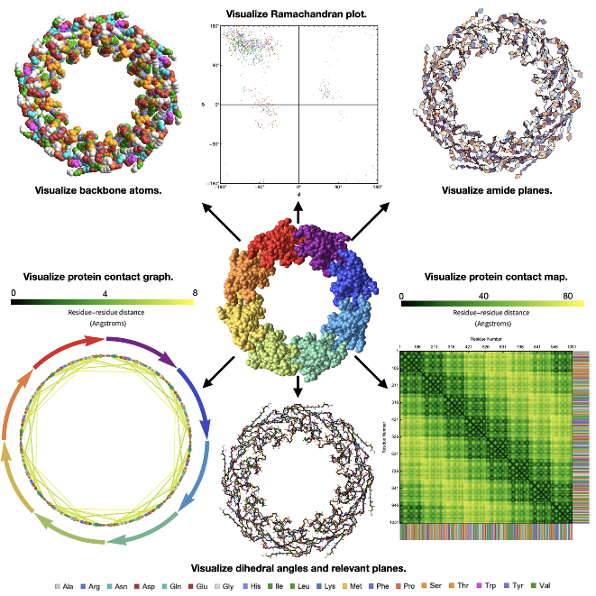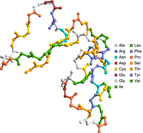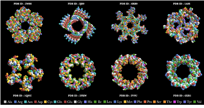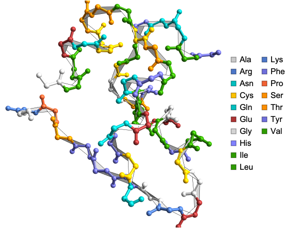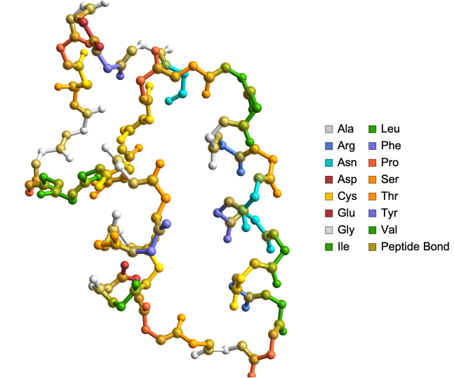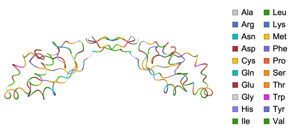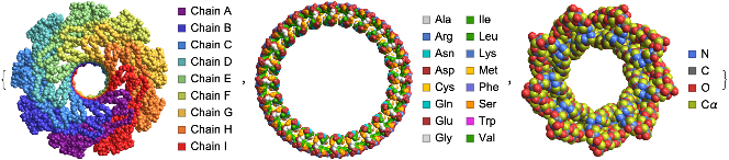 {ProteinBackboneAtomPlot["5GAQ",PlotTheme->"SpaceFilling","BackboneColorRules"->{"Chains",Automatic}],ProteinBackboneAtomPlot["7RDR",PlotTheme->"SpaceFilling","BackboneColorRules"->{"Residues",Automatic}],ProteinBackboneAtomPlot["6XR1",PlotTheme->"SpaceFilling","BackboneColorRules"->{"Atoms",Automatic}]}