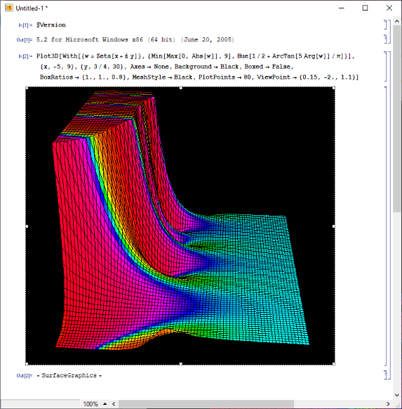 Plot3D[Min[Max[0,Abs[Zeta[x+y]]],9],{x,-5,9},{y,3/4,30},AxesNone,BackgroundBlack,BoxedFalse,BoxRatios{1.,1.,0.8},ColorFunctionFunction[{x,y},Hue[1/2+ArcTan[5Arg[Zeta[x+y]]]/π]],ColorFunctionScalingFalse,ExclusionsNone,ImageSizeLarge,Mesh80,MeshStyleBlack,ViewPoint{0.15,-2.,1.1}]