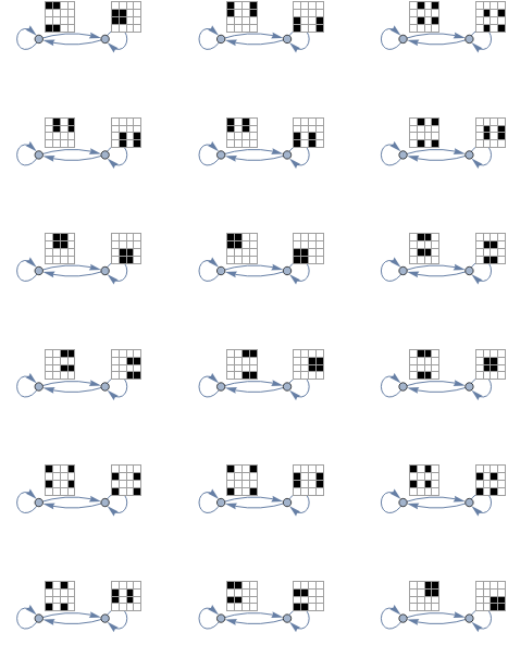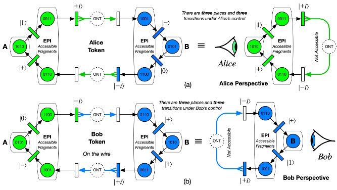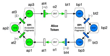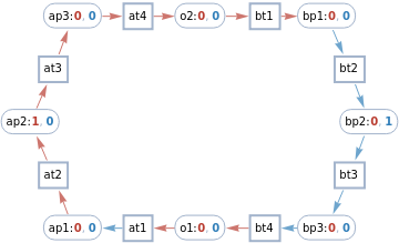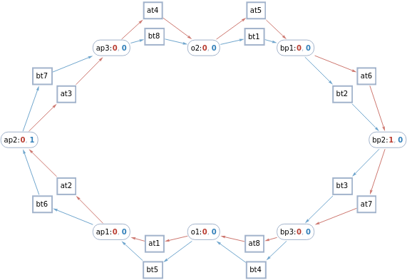spek=<|ap2->{{1,0,1,0},{0,1,0,1}},ap1->{{0,1,1,0},{1,0,0,1}},ap3->{{0,0,1,1},{1,1,0,0}},o1->{{0,0,1,1},{1,1,0,0}},bp2->{{0,1,0,1},{1,0,1,0}},bp1->{{1,0,0,1},{0,1,1,0}},bp3->{{1,1,0,0},{0,0,1,1}},o2->{{1,1,0,0},{0,0,1,1}}|>;getSpekState[net_,places_:All]:=Total@KeyValueMap[spek[#1]#2&,PetriNetTokens[net][[Replace[places,l_List:>Key/@l]]]]getAliceState[net_]:=getSpekState[net,{ap1,ap2,ap3(*,o1*)}]getBobState[net_]:=getSpekState[net,{bp1,bp2,bp3(*,o2*)}]