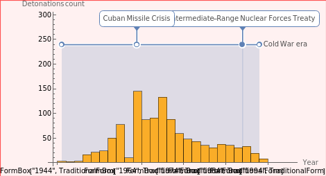 {{underground shaft,1339},{underground tunnel,522},{atmospheric,170},{atmospheric, air drop,85},{atmospheric, earth surface, tower,79},{atmospheric, balloon,62},{atmospheric, earth surface,58},{atmospheric, barge at water surface,41},{underground,13},{cratering burst, shallow subsurface,13},{atmospheric, rocket or missile,13},{space, rocket or missile,10},{underground cavity shaft,7},{underwater,5},{atmospheric high altitude, rocket,5},{underwater, anti-submarine weapon or torpedo,2},{underwater, barge,1},{underground mine,1},{atmospheric, earth surface, rocket,1},{atmospheric, earth surface, air drop,1},{atmospheric, cruise missile at water surface,1},{atmospheric, cruise missile,1},{atmospheric, anti-submarine weapon or torpedo at water surface,1}}