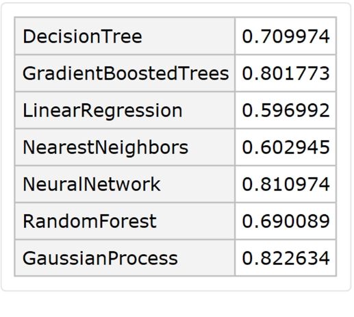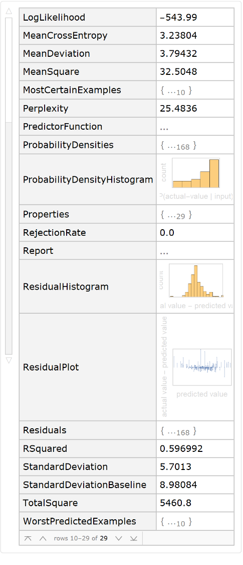 {BatchEvaluationTime,BestPredictedExamples,ComparisonPlot,EvaluationTime,Examples,FractionVarianceUnexplained,GeometricMeanProbabilityDensity,LeastCertainExamples,Likelihood,LogLikelihood,MeanCrossEntropy,MeanDeviation,MeanSquare,MostCertainExamples,Perplexity,PredictorFunction,ProbabilityDensities,ProbabilityDensityHistogram,Properties,RejectionRate,Report,ResidualHistogram,ResidualPlot,Residuals,RSquared,StandardDeviation,StandardDeviationBaseline,TotalSquare,WorstPredictedExamples}