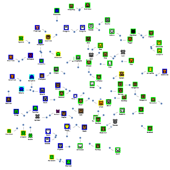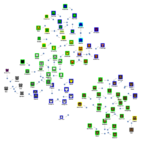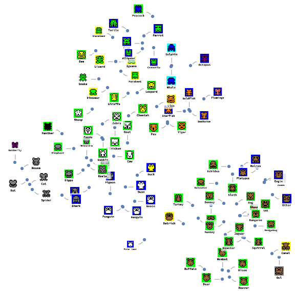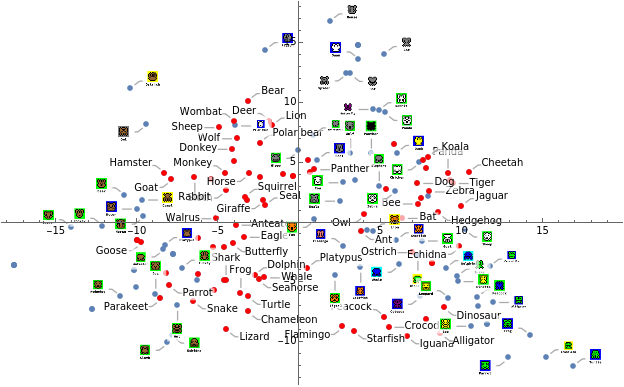We can use FeatureSpacePlot to see how our Rorschach animals are conceptually and visually related to one another in the resulting space.