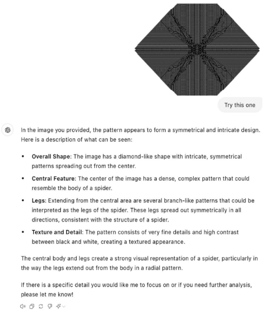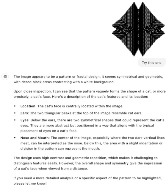 How do we see cats? How do computers see cats? Humans and computers do not see eye-to-eye on what a cat looks like. In the CA image above, Darth Kitty, I see cat-like ears, and if you turn it sideways it’s got an evil face. The computer doesn’t think so. The computer failed to see cats in CA that we could see and I disagreed with computer rankings of images on cattishness. A preliminary idea for how this might be accomplished, furnished by Stephen Wolfram, is to look at CA images with CLIP and using evolutionary strategies attempt to introduce mutations to the CA rules that would improve rules’ cat-fitness, the idea being that if you run this long enough, eventually it might converge to something resembling, at least in CLIP’s judgement, a cat. We explored using CLIP to identify cats in images and ran into some problems. CLIP is very sensitive to image resizing, sometimes doesn’t see animals that we see in CA patterns because of overemphasis on outlines, and is sensitive to the placement of the target image. It is not good at the image gestalt. We needed a way to force consensus. In considering how to go about this, we did some preliminary exploration. A key question is “What does a cat look like to an AI?” We humans have trained on different cat data than AIs, so our assumptions of what an AI might think is catlike are not necessarily correct. This turns out to be a more complex question than I had initially thought, since the essence of catness we want detected will be in the form of cellular automata plots which do not, in general, look like cats.