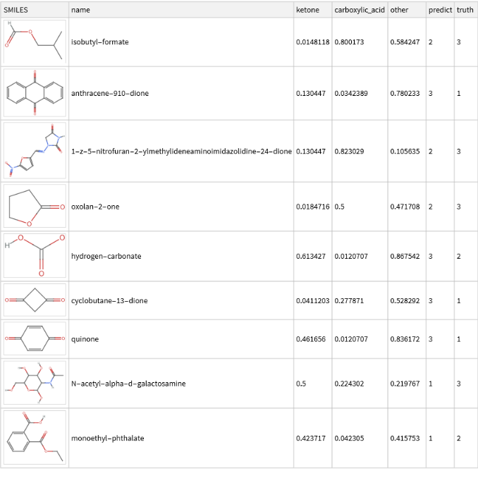 Run the code block below to determine the most probable prediction and display a Dataset comparing the probabilities, the prediction, and the actual label (i.e., the “truth”); each of the categories is assigned an integer code 1=ketone, 2 = carboxylic acid, 3=other: