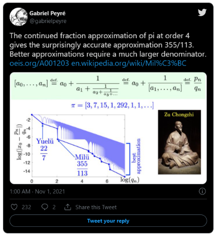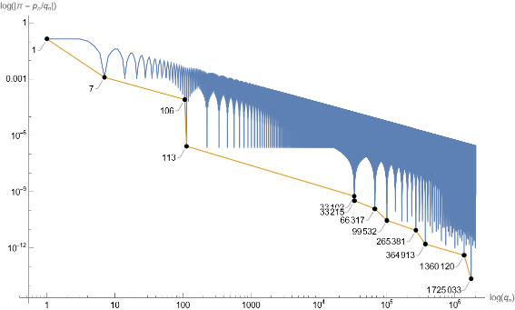 Put the data into the plot function and generate the log-log plot of denominator of nearest rational number vs. error of estimation. The lower bound is connected by continued fraction approximation. The label using the same convention in the twitter.