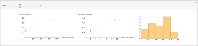 causalMatrix[sortedCoords_List,edgeList_,pointNumber_]:=Module[{CGRules,indexEdges,prematrix},CGRules=sortedCoords[[#]]Range[Length@sortedCoords][[#]]&/@Range[Length@sortedCoords];indexEdges=edgeList/.CGRules;prematrix=Table[{indexEdges[[n,1]],indexEdges[[n,2]]},{n,1,Length@indexEdges}];SparseArray[prematrix[[#]]1&/@Range[Length@prematrix],{pointNumber,pointNumber}]](*GivesalistofallpointsNlinksinthepastofagivenstartingpoint*)layerPastN[linkMatrixTransposed_,x_,n_Integer]:=Flatten[Position[(MatrixPower[linkMatrixTransposed,n])[[x]],_?Positive]]volumeOfVertices[caugraph_,linkMatrixTransposed_,vertexlist_,x_,y_]:=Module[{linkDistance1,linkDistance2,volume1,volume2},Table[linkDistance1=GraphDistance[caugraph,x,vertex];linkDistance2=GraphDistance[caugraph,y,vertex];volume1=Length[DeleteDuplicates[Flatten[layerPastN[linkMatrixTransposed,vertex,#]&/@Range[linkDistance1]]]];volume2=Length[DeleteDuplicates[Flatten[layerPastN[linkMatrixTransposed,vertex,#]&/@Range[linkDistance2]]]];volume1+volume2,{vertex,vertexlist}]] (*Givesthepointvolumeofthetriangleformedbytwospacelikepointsandthepointwheretheirlightconesintersect*)spaceVolume[linkmatrix_,causalmatrixTransposed_,caugraph_,x_,y_]:=Module[{slice1,slice2,posvertexList,caufollow,vertexlist,linkMatrixTransposed,totalVolume},linkMatrixTransposed=Transpose[Normal[linkmatrix]];slice1=Select[causalmatrixTransposed,(#[[x]]*#[[y]])==1&];posvertexList=Flatten[Position[causalmatrixTransposed,slice1[[#]]]&/@Range[Length[slice1]]];caufollow=DeleteDuplicates[Flatten[Table[Select[causalmatrixTransposed,#[[n]]==1&],{n,posvertexList}],1]];slice2=Select[slice1,!MemberQ[caufollow,#]&];vertexlist=DeleteDuplicates[Flatten[Position[causalmatrixTransposed,slice2[[#]]]&/@Range[Length[slice2]]]];totalVolume=volumeOfVertices[caugraph,linkMatrixTransposed,vertexlist,x,y];Min[totalVolume]/2.0](*Calculatesthespacelikedistanceoftwospacelikepointsusingtheabovefunctions*)spaceDistance2D[linkmatrix_,causalmatrixTransposed_,caugraph_,x_,y_,density_]:=Module[{volume},volume=spaceVolume[linkmatrix,causalmatrixTransposed,caugraph,x,y];2*Sqrt[volume/density]]createCausalMatrices[causalMatrix_]:=Module[{linkmatrix,causalmatrixTransposed,reducedCausalGraph},reducedCausalGraph=TransitiveReductionGraph[AdjacencyGraph[causalMatrix]];linkmatrix=AdjacencyMatrix[reducedCausalGraph];causalmatrixTransposed=Transpose[Normal[causalMatrix]];{linkmatrix,causalmatrixTransposed,reducedCausalGraph}](*Calculatesthetimelike/spacelikedistanceofeachpairofpointsonaCausalSetusingtheabovefunctionsandlengthoflongestchainmethodfortimelikedistance*)spaceTimeDistance2D[causalmatrix_,density_]:=Module[{pointNumber,lChainMatrix,DistanceMatrix,spacelikePairs,distanceMatrix,linkmatrix,causalmatrixTransposed,caugraph},{linkmatrix,causalmatrixTransposed,caugraph}=createCausalMatrices[causalmatrix];pointNumber=Length[linkmatrix];lChainMatrix=Total[UnitStep[NestWhileList[#.causalmatrix&,causalmatrix,#≠ConstantArray[0,{pointNumber,pointNumber}]&]-0.1]];DistanceMatrix=N[lChainMatrix/(2*Sqrt[(density/2)])];spacelikePairs=Select[Position[Normal[lChainMatrix],0,2],#[[1]]<#[[2]]&];(DistanceMatrix[[spacelikePairs[[#,1]],spacelikePairs[[#,2]]]]=spaceDistance2D[linkmatrix,causalmatrixTransposed,caugraph,spacelikePairs[[#,1]],spacelikePairs[[#,2]],density])&/@Range[Length[spacelikePairs]];DistanceMatrix]spaceTimeDistance2D[causalmatrix_,density_,pointsInOpenset_]:=Module[{pointNumber,lChainMatrix,DistanceMatrix,spacelikePairs,distanceMatrix,linkmatrix,causalmatrixTransposed,caugraph},{linkmatrix,causalmatrixTransposed,caugraph}=createCausalMatrices[causalmatrix];pointNumber=Length[linkmatrix];lChainMatrix=Total[UnitStep[NestWhileList[#.causalmatrix&,causalmatrix,#≠ConstantArray[0,{pointNumber,pointNumber}]&]-0.1]];DistanceMatrix=N[lChainMatrix/(2*Sqrt[(density/2)])];spacelikePairs=Select[Position[Normal[lChainMatrix],0,2],(pointsInOpenset[{#[[1]]}]&&pointsInOpenset[{#[[2]]}]&&#[[1]]<#[[2]])&];(DistanceMatrix[[spacelikePairs[[#,1]],spacelikePairs[[#,2]]]]=spaceDistance2D[linkmatrix,causalmatrixTransposed,caugraph,spacelikePairs[[#,1]],spacelikePairs[[#,2]],density])&/@Range[Length[spacelikePairs]];DistanceMatrix]