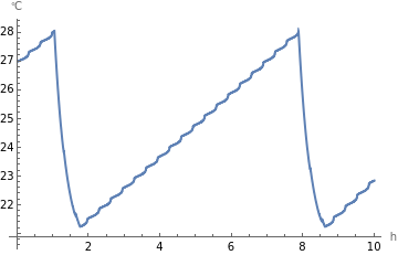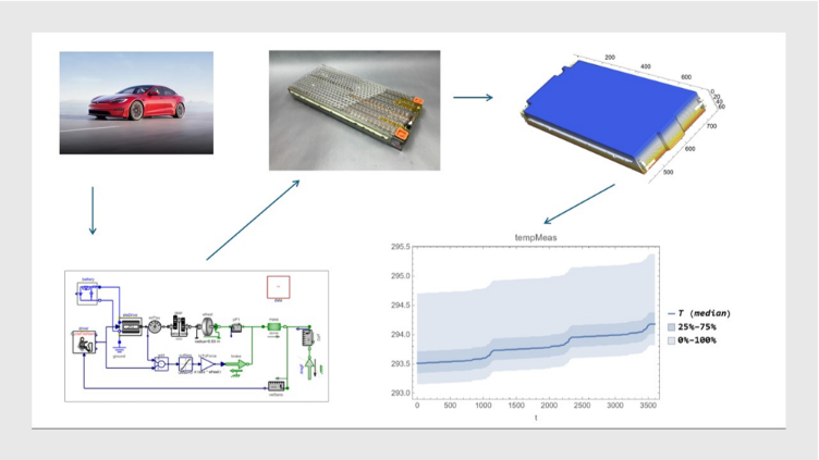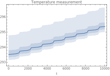 SystemModelUncertaintyPlot[model,<|"Outputs"->{"tempMeas"},"ParameterValues"->{"deviation.k"->QuantityDistribution[TruncatedDistribution[{0,Infinity},NormalDistribution[0,Mean[StandardDeviation[Tfun["ValuesOnGrid"]]]]],"Kelvins"]},"InterpolationPoints"->200,"SimulationInterval"->{0,10000}|>,PlotLabel->"Temperature measurement"]