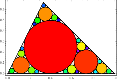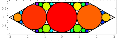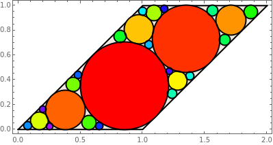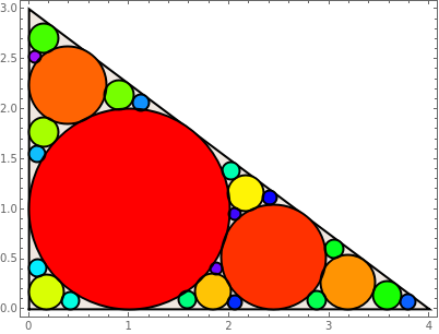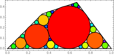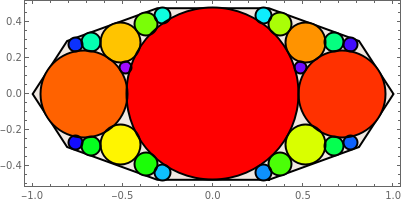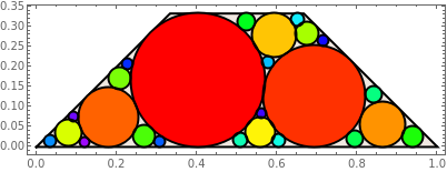 pack[reg_,n_]:=Block[{disk,diski,circi,cons,consDJ,x,y,r,time,ds,cs,pf},disk=Disk[{x,y},r];(*Definetheinitialdisk*)diski[i_]=Disk[{x[i],y[i]},r[i]];(*Definethediskifunctiontocreatediskswithvaryingradii*)circi[i_]=RegionBoundary[diski[i]];(*Definethecircifunctiontogettheboundaryofthedisks*)cons=List@@(RegionWithin[reg,disk]);consDJ[i_]:=RegionDisjoint[diski[i],disk];(*Performtheoptimizationandmeasurethetimetaken*)time=AbsoluteTiming@Do[{Thread[{x[i],y[i],r[i]}=NArgMax[{r,cons},{x,y,r}]],cons=Join[cons,{consDJ[i]}]},{i,n}];(*Calculateandprintthepackingfraction*)Print["optimization time = ",time[[1]]];pf=Sum[Area@diski[i],{i,n}]/Area[reg];Print["packing fraction =",pf];(*Displaythepackeddiskswithintheregion*)Show[Region[Style[reg,LightBrown,EdgeForm[{Thick,Black}]]],Graphics@Table[{Hue[0.8*(i-1)/n],diski[i]},{i,n}],Graphics@{Thick,Black,Table[circi[i],{i,n}]},Frame->True]]