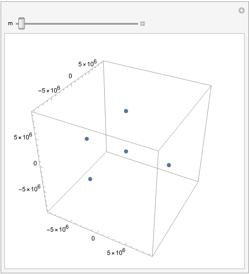 set={earth"Mass"5.97219*10^24,"Position"{0,0,0},"Velocity"{0,0,0},sat1"Mass"1,"Position"{7371000,0,0},"Velocity"{0,-7357,0},sat2"Mass"1,"Position"{0,0,7371000},"Velocity"{0,-7357,0},sat3"Mass"1,"Position"{7371100,0,0},"Velocity"{-7357,0,0},sat4"Mass"1,"Position"{7371200,0,0},"Velocity"{0,7357,0},sat5"Mass"1,"Position"{0,0,7371100},"Velocity"{0,7357,0},sat6->"Mass"1,"Position"{7371250,0,0},"Velocity"{0,4729.63123207,5636.55501247},sat7->"Mass"1,"Position"{-4256000,-4256000,-4256000},"Velocity"{-1000,-1000,7500},sat8->"Mass"1,"Position"{7371025,0,0},"Velocity"{0,-4725.13171881,5631.19270137},sat9->"Mass"1,"Position"{-7371025,0,0},"Velocity"{0,-4725.13171881,5631.19270137}};