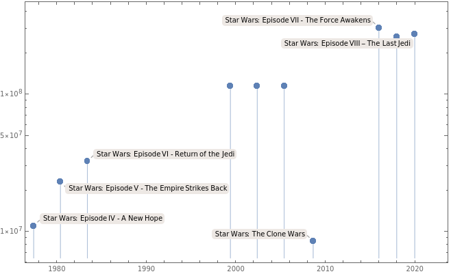 releaseBudgetAssos=SortBy[First]@EntityValue​​EntityClass["Movie","StarWarsFranchise"],​​
