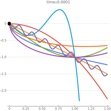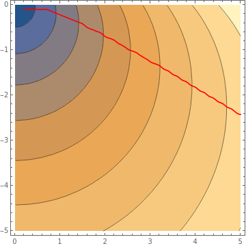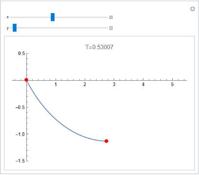Time[X_,Y_]:=Module[{sol,T,g=9.8,y},sol=NDSolve[{1+Derivative[1][y][x]^2+2y[x](y''[x])==0,y[1]==1,y[X+1]==Y+1},y[x],{x,1,X+1}];T=NIntegrate[Sqrt[(1+y'[x]^2)/(2gy[x])]/.sol[[1,1]]/.{y'[x]->D[y[x]/.sol[[1,1]],x]},{x,1,X+1}]]redPoints=FindMinimum[Time[#,y],{y,1}]&/@Range[0.01,5,0.01]//Quiet;